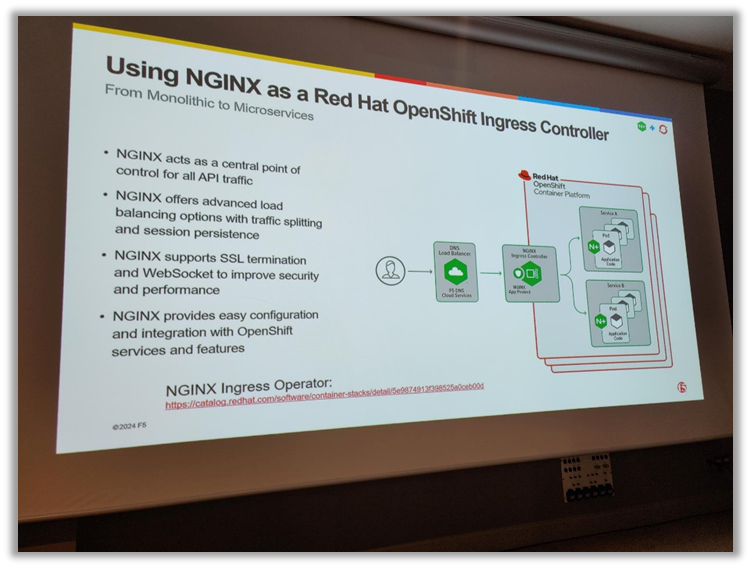 Thomas Genet, Solutions Engineer chez F5, a mis en avant l'importance de NGINX en tant qu'ingress controller pour OpenShift. Grâce à une architecture solide, NGINX offre des fonctionnalités essentielles telles que le traffic splitting, le routing conditionnel, et la protection WAF, cruciales pour assurer une livraison sécurisée des applications dans des environnements à forte demande.
