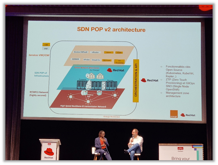 Orange a entrepris un projet de modernisation avec l'utilisation d'OpenShift Virtualization, visant à unifier la gestion des workloads conteneurisés et virtualisés. Leur infrastructure SDN POP v2 permet de combiner VNF et CNF, offrant une architecture plus sécurisée et capable de supporter des services critiques tels que SDWAN et Mobile Core. Le projet vise à déployer 50 POPs d'ici 2024 et 75 d'ici 2026, réduisant ainsi les coûts et améliorant la flexibilité du réseau.